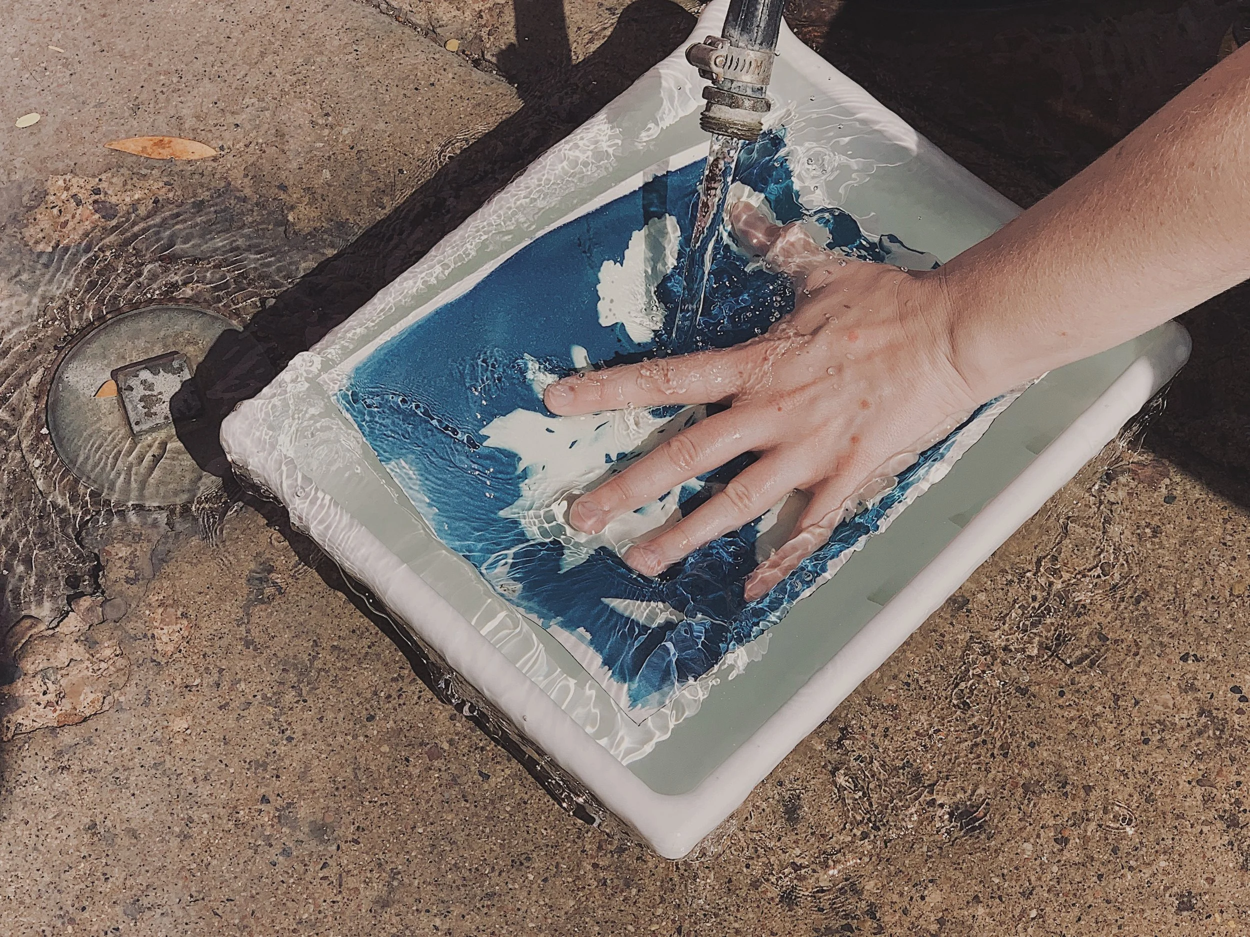 Sunlight changes everything. The fluorescent green chemistry shift to a strange greenish grey and tones of blue. I wait for the perfect moment to pull the print out of the light. A rinse in cool water washes away what was unexposed, and the color shifts to the classic cyanotype blue.